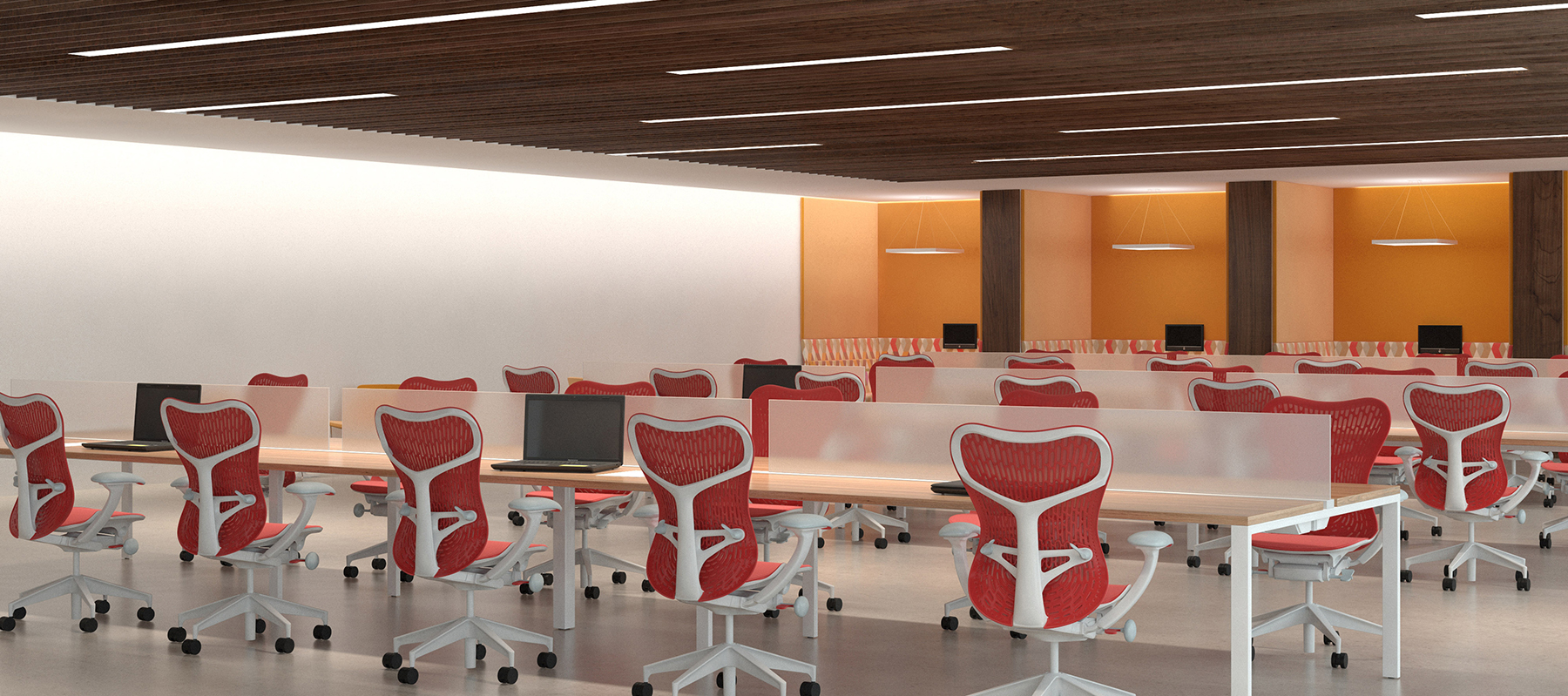 Precise configuration of LED light module and housing provide shadow-free wall-to-wall illumination inruns and corners. Concealed LED module creates seamless lines of light to provide the perfect blend of high performance and visual comfort.