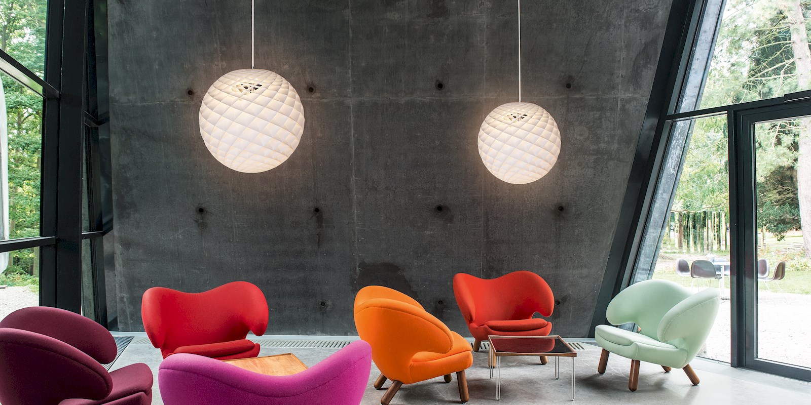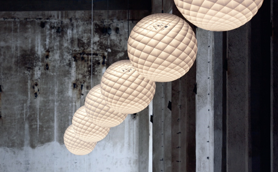 The pendant is a glowing sphere built up of small diamond-shaped cells.  Each cell is carefully designed to capture light and to shield the light source from the viewing angles above 45 degrees.  Below 45 degrees, the fields are open to direct light downwards.  A small amount of light is also sent upwards to illuminate the ceiling.