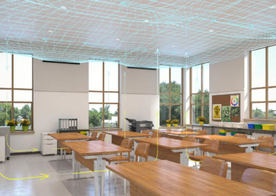 PURIFII AER W SYSTEMS are installed to create a contactless, uniform, germicidal zone in the upper portion of the room. HVAC systems, fans and/or natural convection move air between the lower and upper portions of the room, allowing for continuous disinfection of the air. The PURIFII AER W SYSTEM features a streamlined aesthetic allowing for unobtrusive use in nearly any interior space.