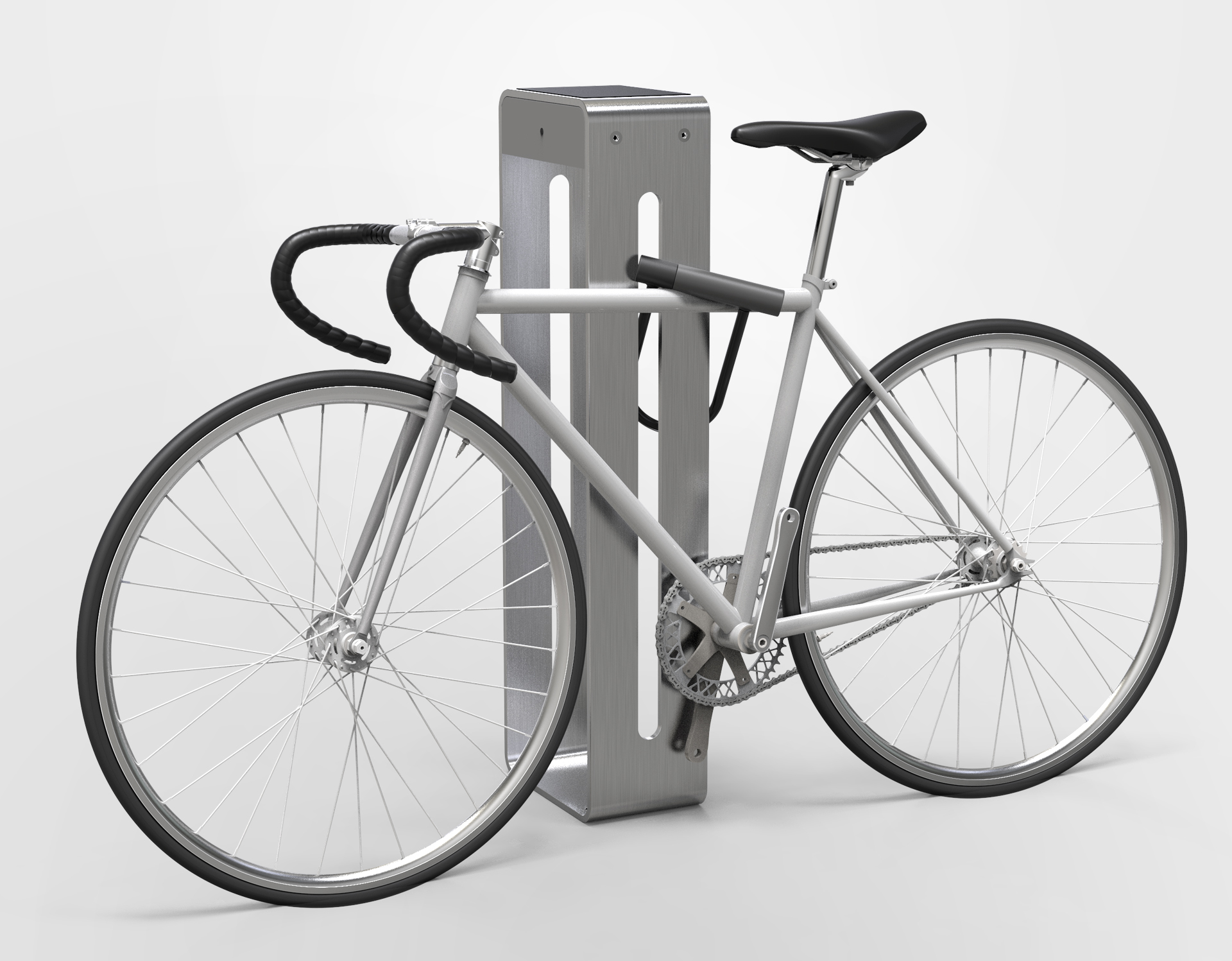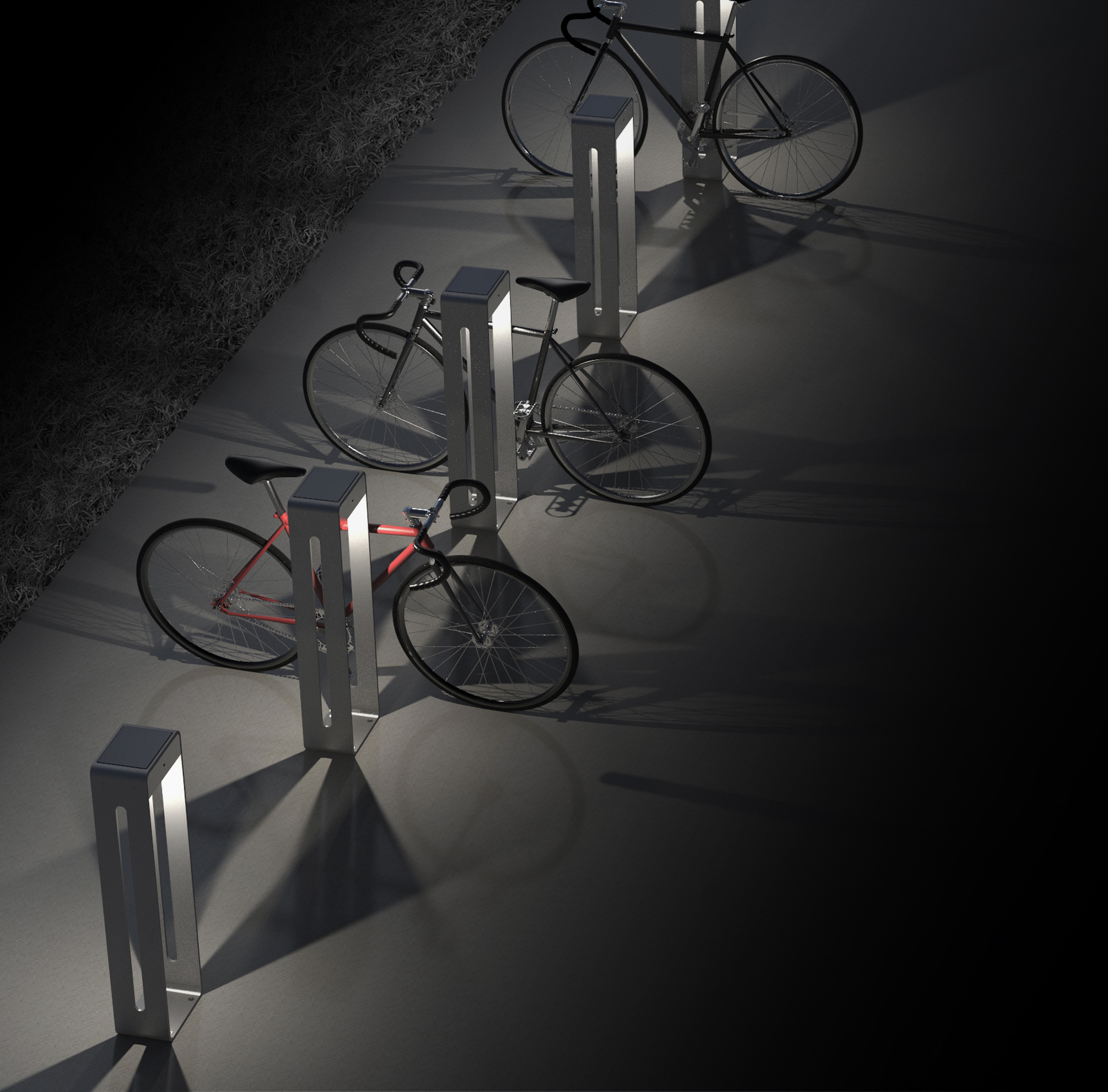 Multi-functional bike rack serving as a wayfinder with advanced solar powered LED lighting.