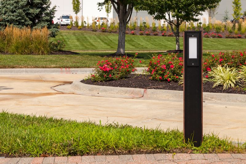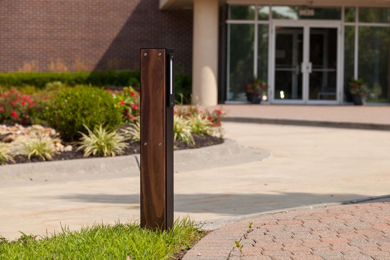 Aluminum pedestrian traffic bollard with decorative contrasting accent panels.