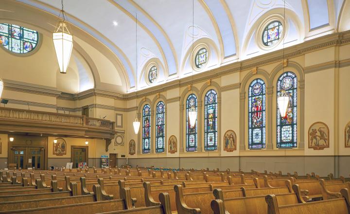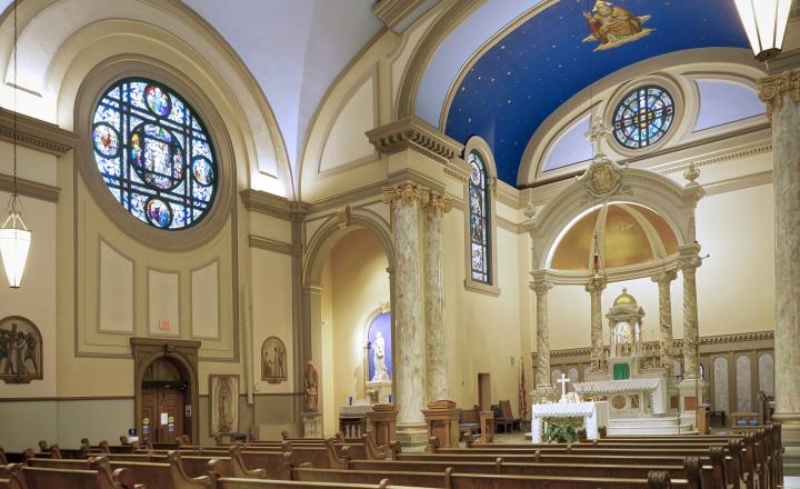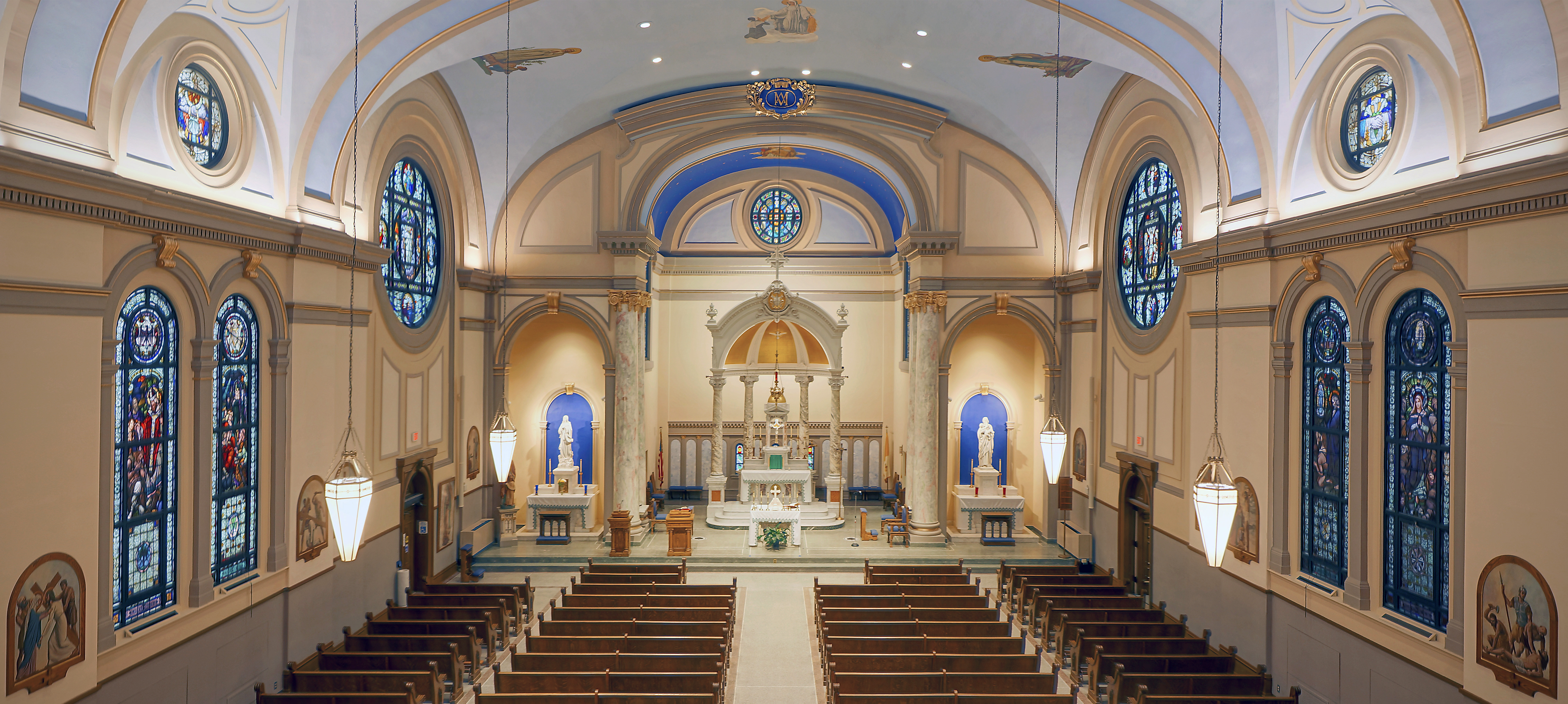 Immaculate Conception Church in Cedar Rapids, IA, built in 1915 and last updated in the 1980's, was ready for a facelift.  The members were able to raise enough funds for plaster repair, painting, carpet removal and approximately $100,000 of lighting improvements.  Aged Metal Halide flood lighting and focus spots were providing 5 to 12 fc in the seating area and unsightly color shifting across the ceiling and walls.