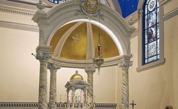 At the main altar, existing incandescent flood lighting highlighted the altar and podium.  These fixtures were replaced with four LED stage lights(ETC Source Four) in the attic and aimed through the existing openings.  The small altar under the baldachin and the upper semi-circle contained aging incandescent lamp holders and were replaced with dimmable LED fixtures without running new wiring.  Behind the golden dome, five LED troffers (Williams) were hidden to provide dimmable, controllable up-lighting.