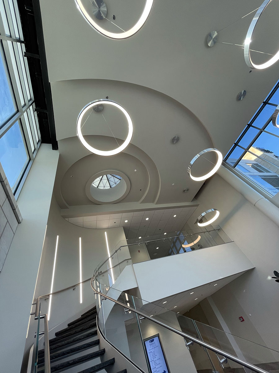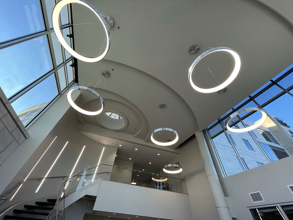 The lobby area of Bridge Plaza is illuminated with G Lighting Orbis fixtures. Mounted to high ceilings, these high output rings give the space a great design with plenty of lighting as you walk into the building.