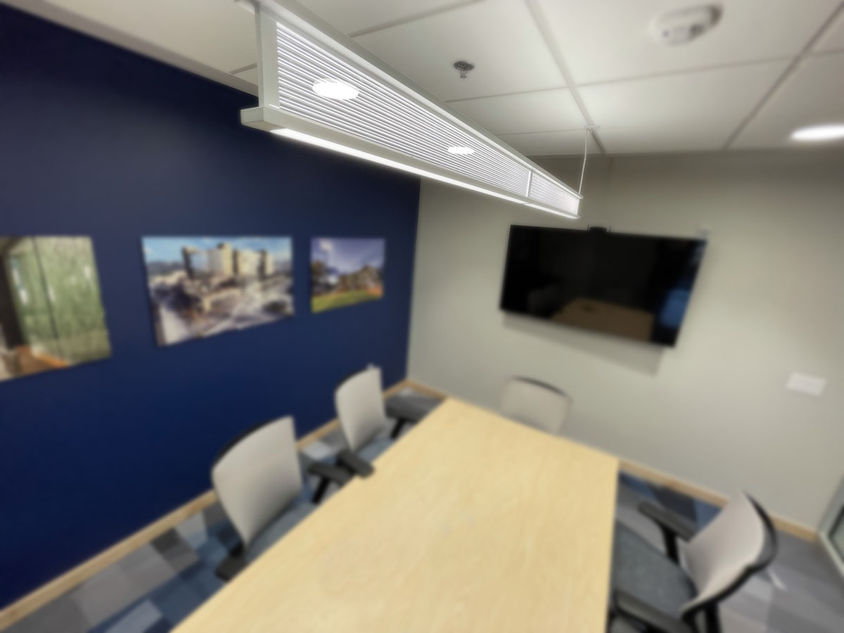 The Fluxwerx View fixtures are placed throughout the work space to provide general illumination. Because of the great distribution provided, they were able to reduce the number of fixtures while keeping great light levels. These architecturally designed fixtures were also the statement fixtures placed above all conference room tables.