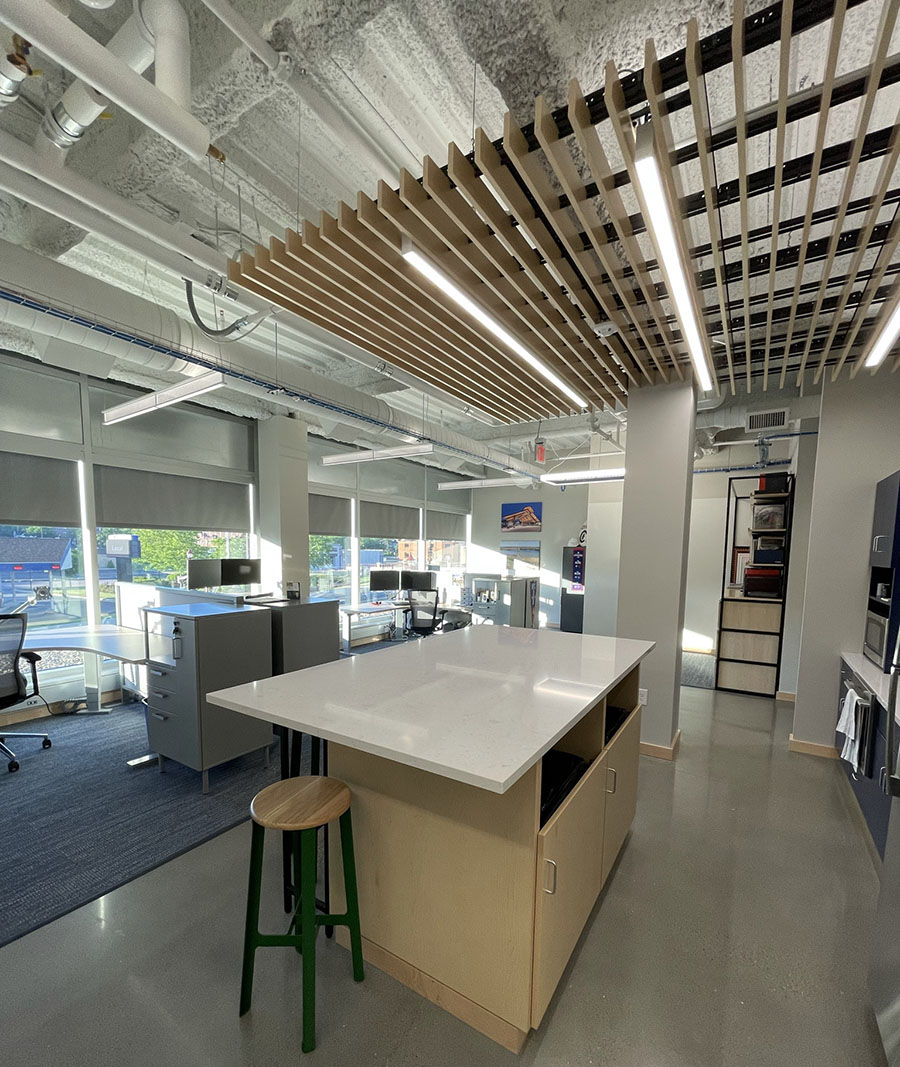 The team designed the kitchen area by placing linear 3G lighting in between wood slatted panels hanging down from the open ceiling. This beautiful look not only helps with sound absorption, but provides a stand out piece that provides ample lighting.